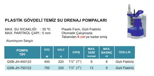 Plastik gövdeli, mekanik salmastralı, otomatik resetli termik korumalı motor, kirli su deşarjı için maksimum 5 mm tane büyüklüğüne uygun, temiz ve kirli su deşarjına uygun dalgıç pompa. Rögar içinde flatör takılmalarına karşı dikey elektronik flatörlüdür, kabloludur. Max. su sıcaklığı 35˚C, ortam sıcaklığı 40˚C’dır.