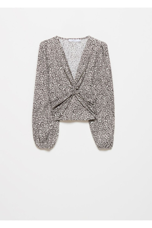Gardırobunuza zarif ve modern bir dokunuş katın! Siyah beyaz çiçek desenleriyle süslenmiş, kruvaze yaka ve düğüm detayıyla ön plana çıkan bu bluz, şıklığınızı tamamlar.