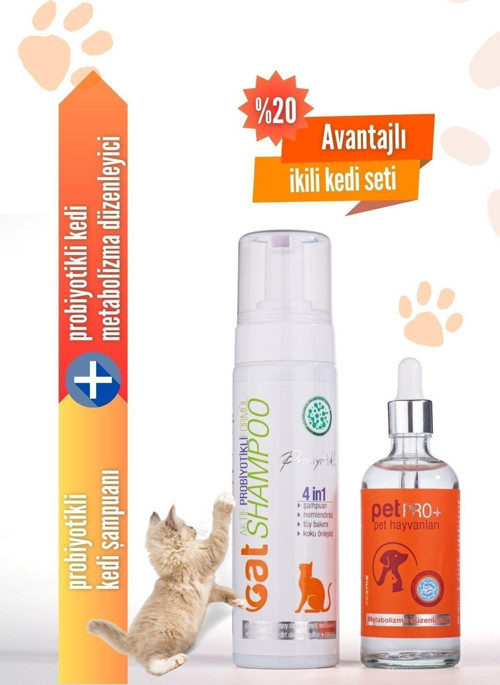 Vetorin Avantajlı İkili Kedi Seti: 1 adet probiyotikli kedi şampuanı, 1 adet probiyotikli pet metabolizma düzenleyici içerir.