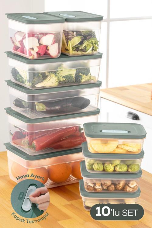 Vienev 10'lu Hava Kanallı Ayarlanabilir Sebze ve Meyve Saklama Kabı 4x(1,15 lt) 2x(2,35-3,8-5 lt) Yeşil