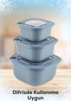 Günlük yaşamın pratik çözümü: 3'lü Mikrodalga ve Dondurucuya Uygun VIP Kapaklı Özel Saklama Kabı Seti! Bu set, farklı boyutlardaki üç kap ile yiyeceklerinizi en uygun şekilde saklamanızı sağlar.