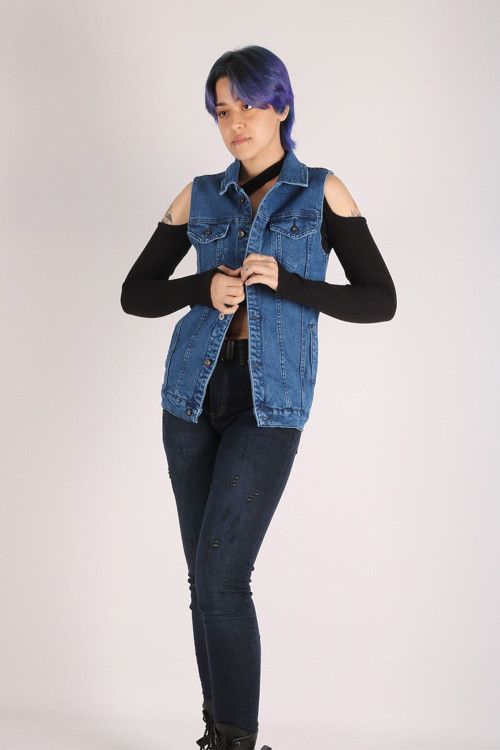 Ceket yakası detayı ile klasik jean yelek görünümüne modern bir dokunuş ekler.