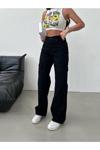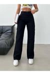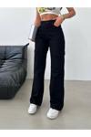 Kadın Siyah Kargo Yüksek Bel Geniş Paça Kargo Pantolon
