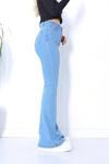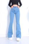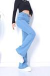 Genç tesettür giyim koleksiyonuna özel tasarlanmış, açık mavi renkli yüksek bel ispanyol pantolonu ile günlük şıklığınıza zarif bir dokunuş ekleyin.