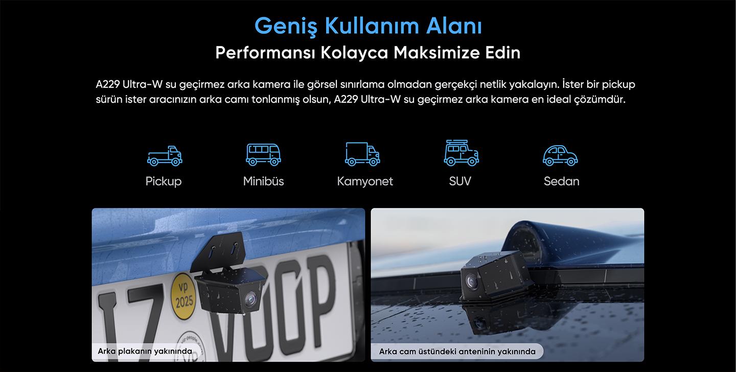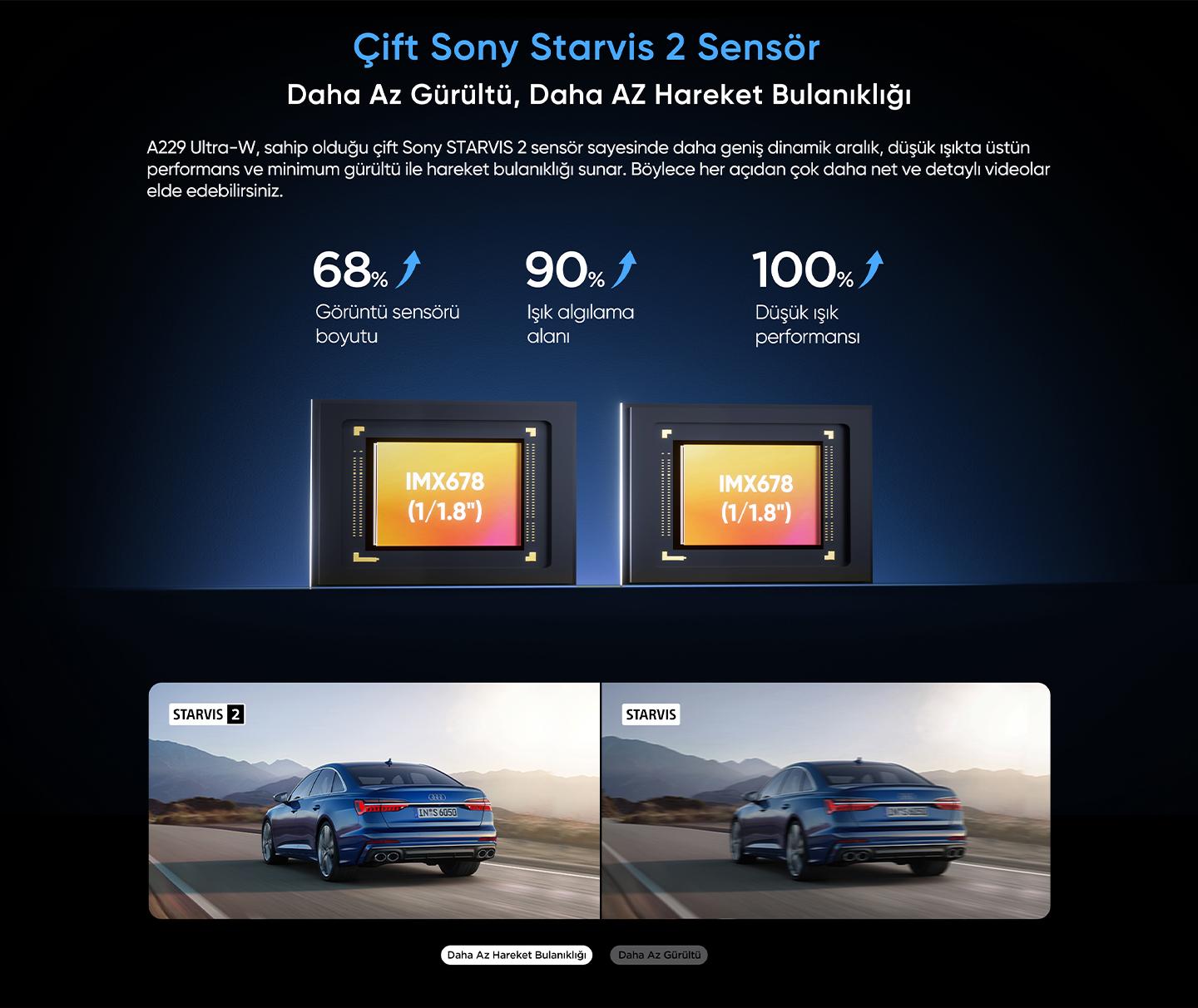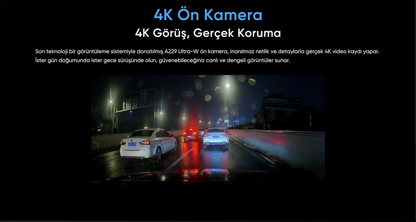 VIOFO A229 Ultra-W, çift yönlü 4K çözünürlük sunan gelişmiş bir araç kamerası sistemidir. Bu yenilikçi 4k araç kamerası, ön ve arkada bulunan Sony STARVIS 2 sensörleri ile kristal netliğinde görüntü kalitesi sağlar. IP67 standartında su geçirmez kamera özelliği sayesinde her türlü hava koşulunda güvenle kullanabilirsiniz. Arka su geçirmez kamera ile aracınızın her açısından tam koruma altında olursunuz.