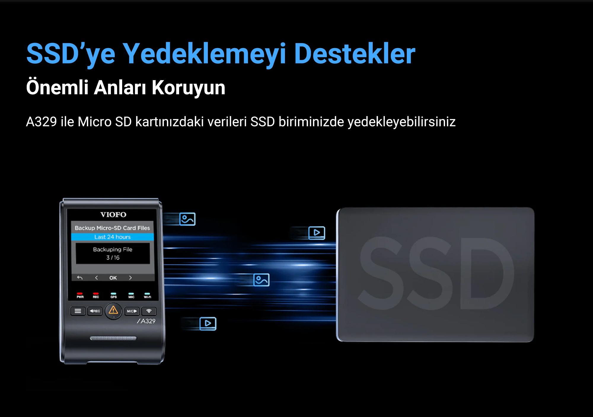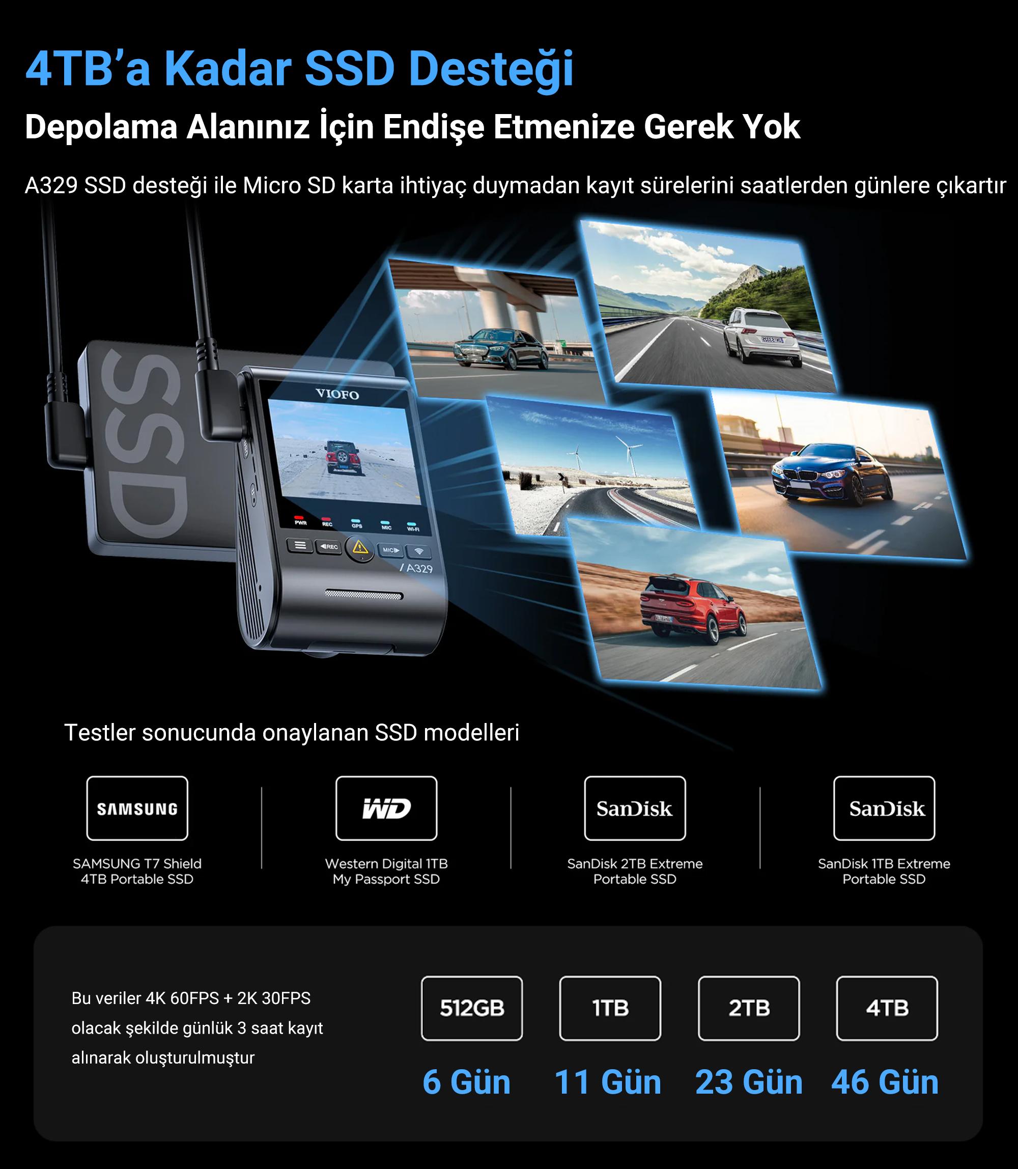 İlk SSD destekli Viofo araç kamerası olan A329 kayıtlarınızı 4TB'a kadar harici olarak bağladığınız SSD içerisine kaydederek depolama alanınızı büyük ölçüde arttırır böylece döngüsel kayıt süreleri günleri bulabilir. Depolama aracı olarak SSD kullandığınız durumlarda Micro SD kart kullanmanıza gerek kalmaz.