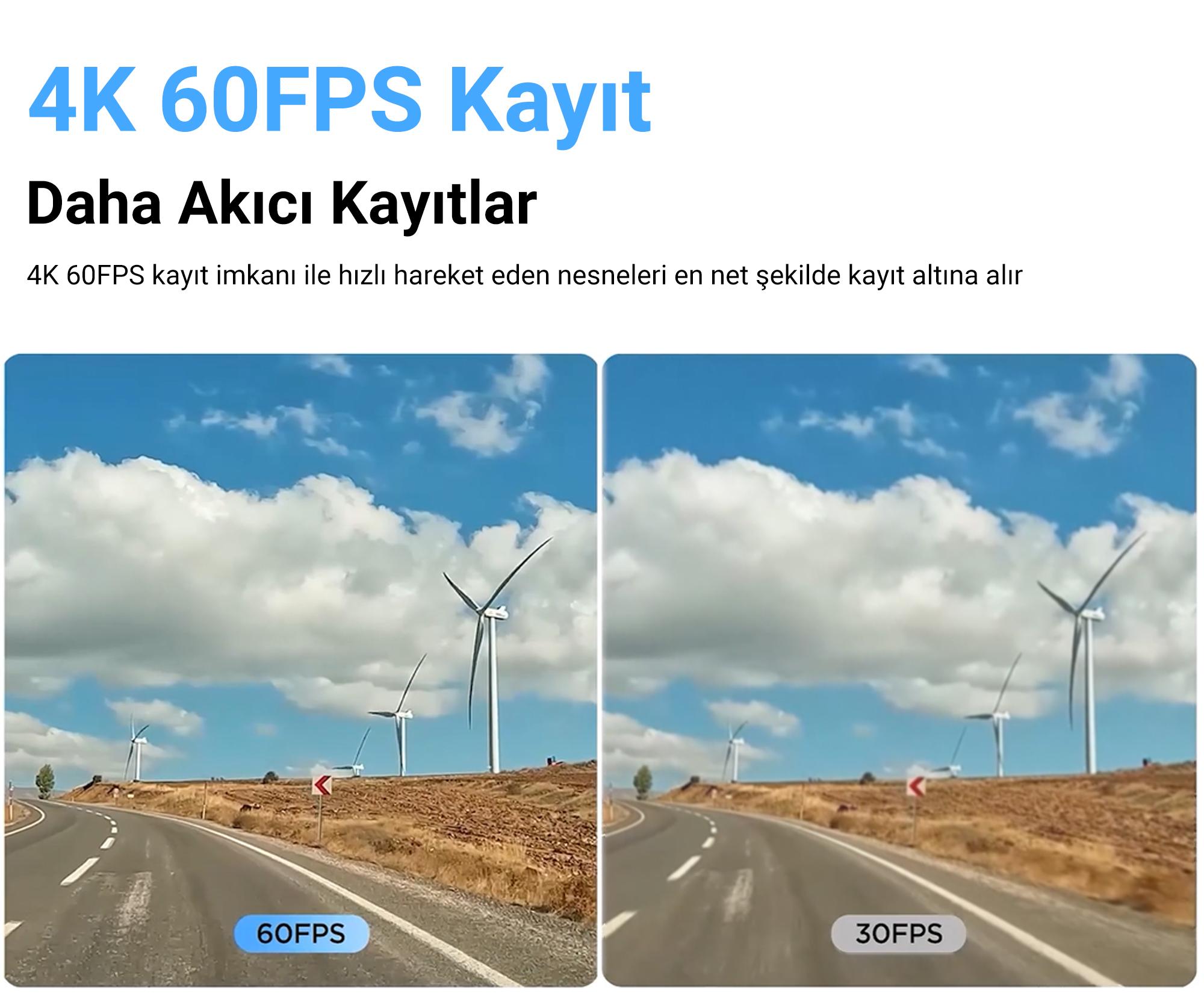 Kamera 4K 60FPS çözünürlükte kayıt alarak hareket akıcılığını arttırır böylece yüksek hızlarda daha net kayıtlara sahip olmanızı sağlar.