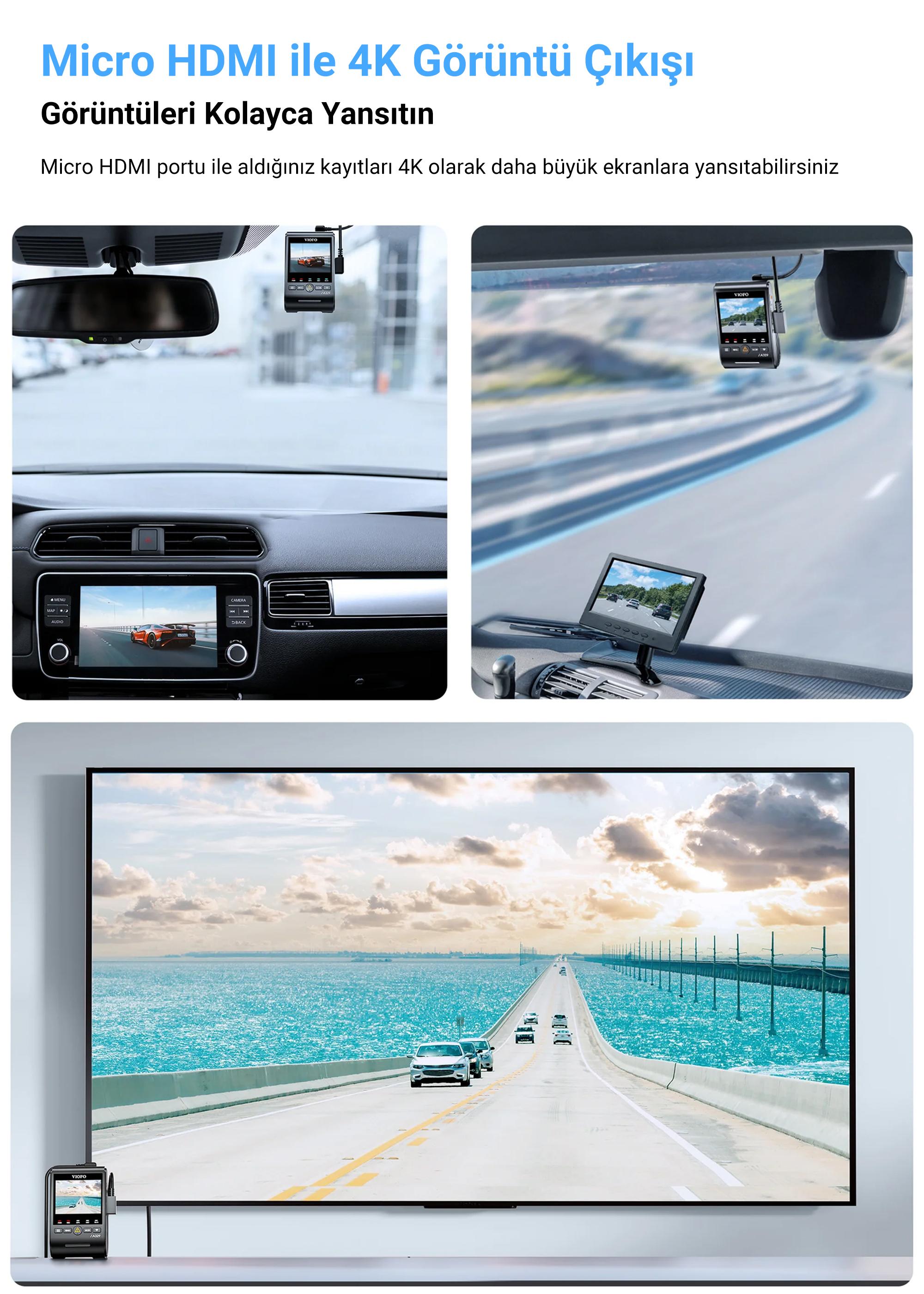 Üzerinde bulunan Micro HDMI portunu kullanarak görüntüleri monitör, televizyon gibi cihazlara direkt olarak yansıtıp izlemenin yanında aracınızda bulunan ekranlara kamera kaydını anlık olarak yansıtabilirsiniz.