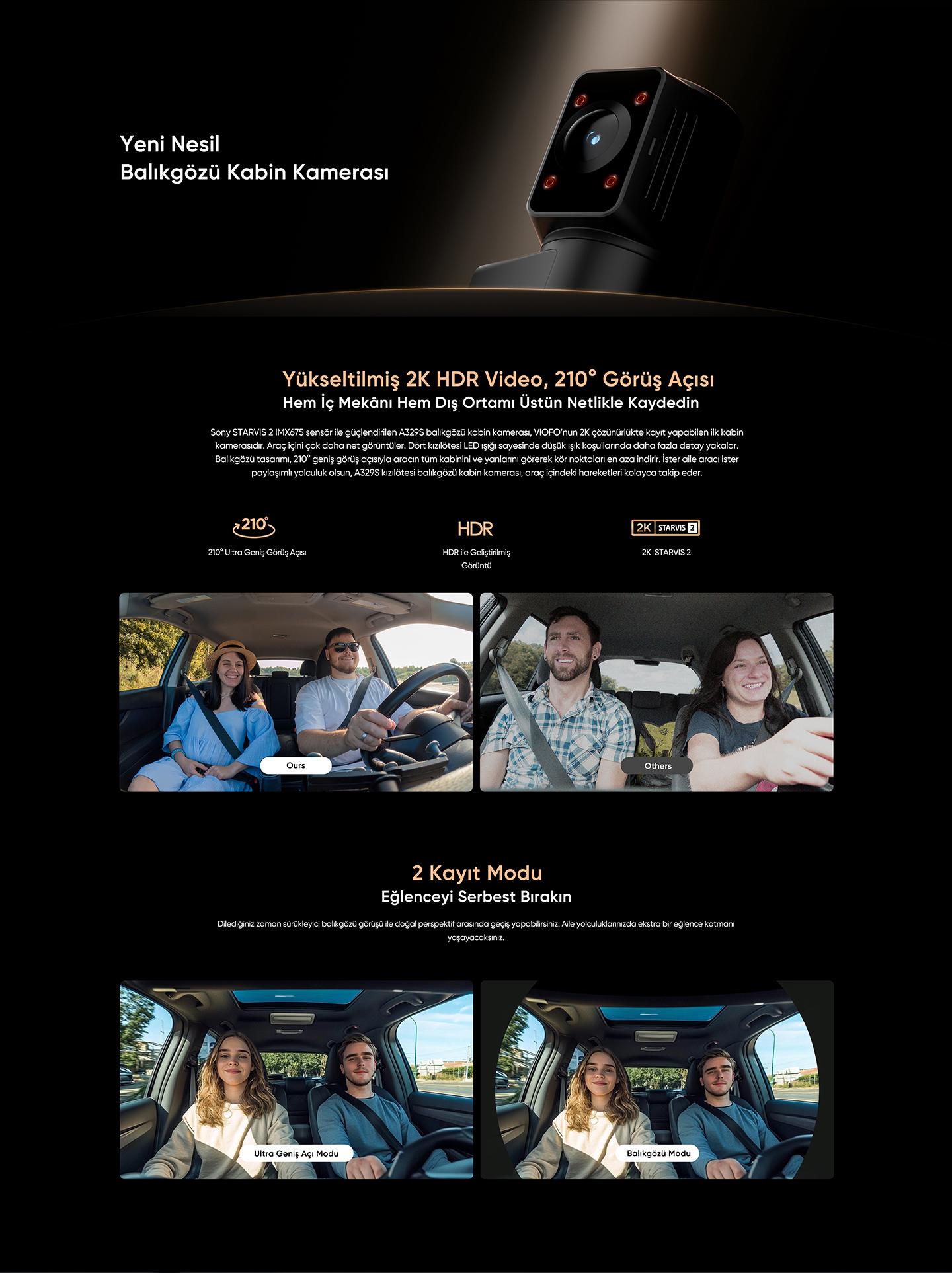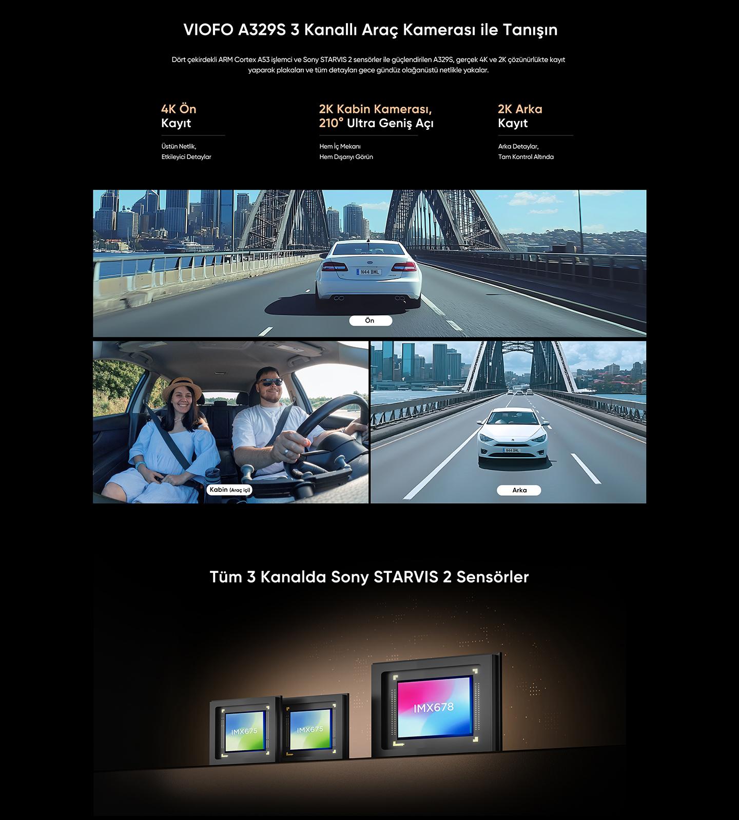 Viofo A329S 3 kameralı araç kamerası gerçek 4K teknolojisi ile donatılmış ön, arka, ve iç sensörleri Sony Lensler ile donatılmış profesyonel akıllı bir araç kamera sistemidir. Sony Starvis 2 sensör teknolojisi sayesinde üstün görüntü kalitesi sunan bu araç içi kamera, hem ön-Arka ve iç kayıt özelliği ile tam koruma sağlar. 4K 30FPS kayıt çözünürlüğü daha fazla detay ve net görüntülere sahip olmanızı sağlar. Wi-Fi 6 bağlantısı sayesinde görüntülerinizi telefonunuza hızlı bir şekilde aktarmanıza imkan tanır. Gerçek 4K teknolojisi ile her anı kristal netliğinde kaydedin. 24 saat kayıt özelliği sayesinde aracınız park halindeyken bile güvende olur. Bu premium araç kamerası, SSD desteği ve GPS takibi ile uzun mesafeli seyahatlerde ideal performans sunar.