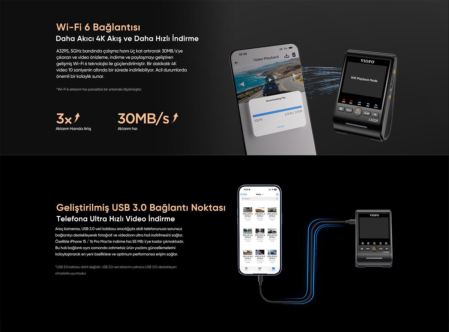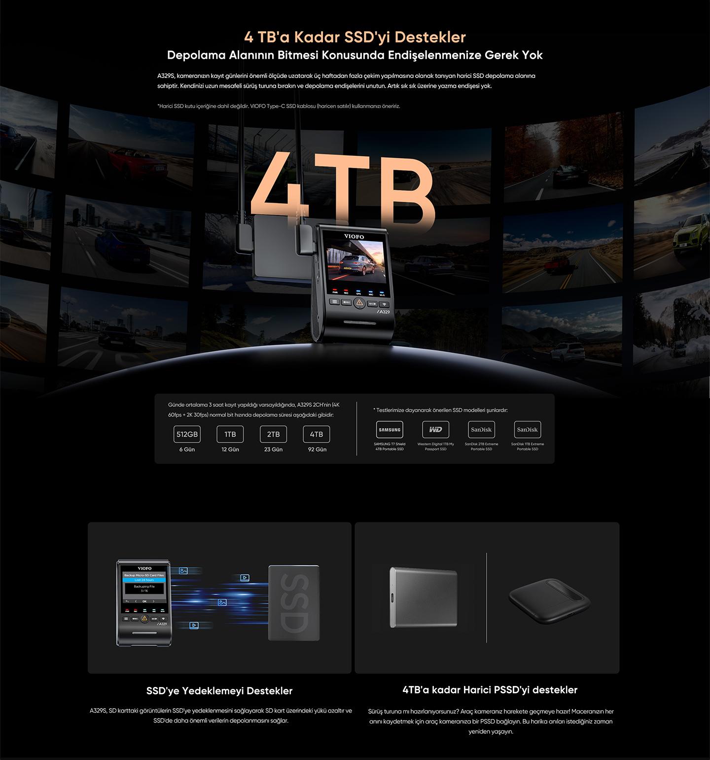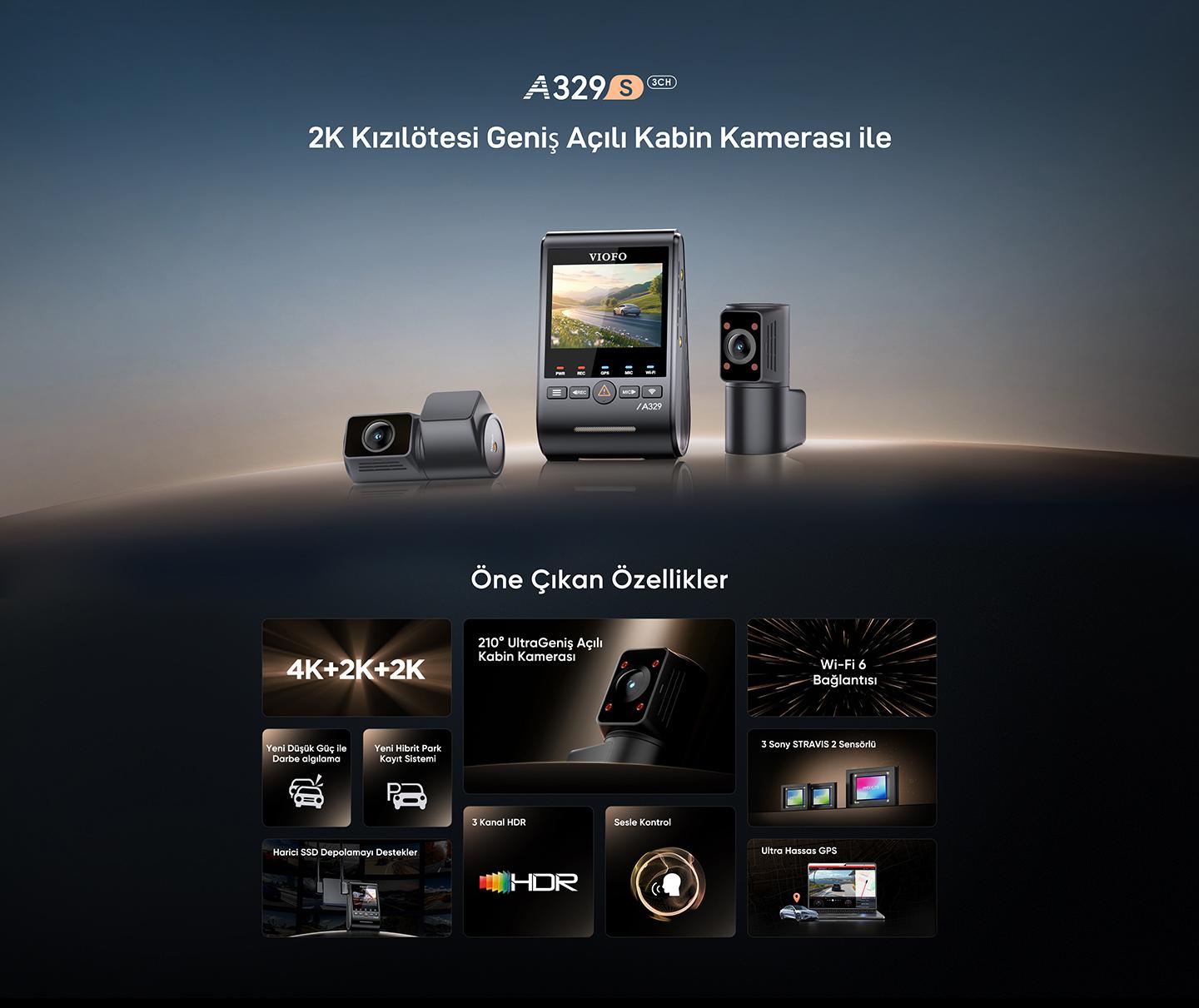 Viofo A329S, gerçek 4K teknolojisi, Sony Starvis 2 sensör, Wi-Fi 6 bağlantısı, GPS takip, ses kontrolü, HDR kayıt ve 4TB SSD desteği gibi gelişmiş özelliklere sahiptir.