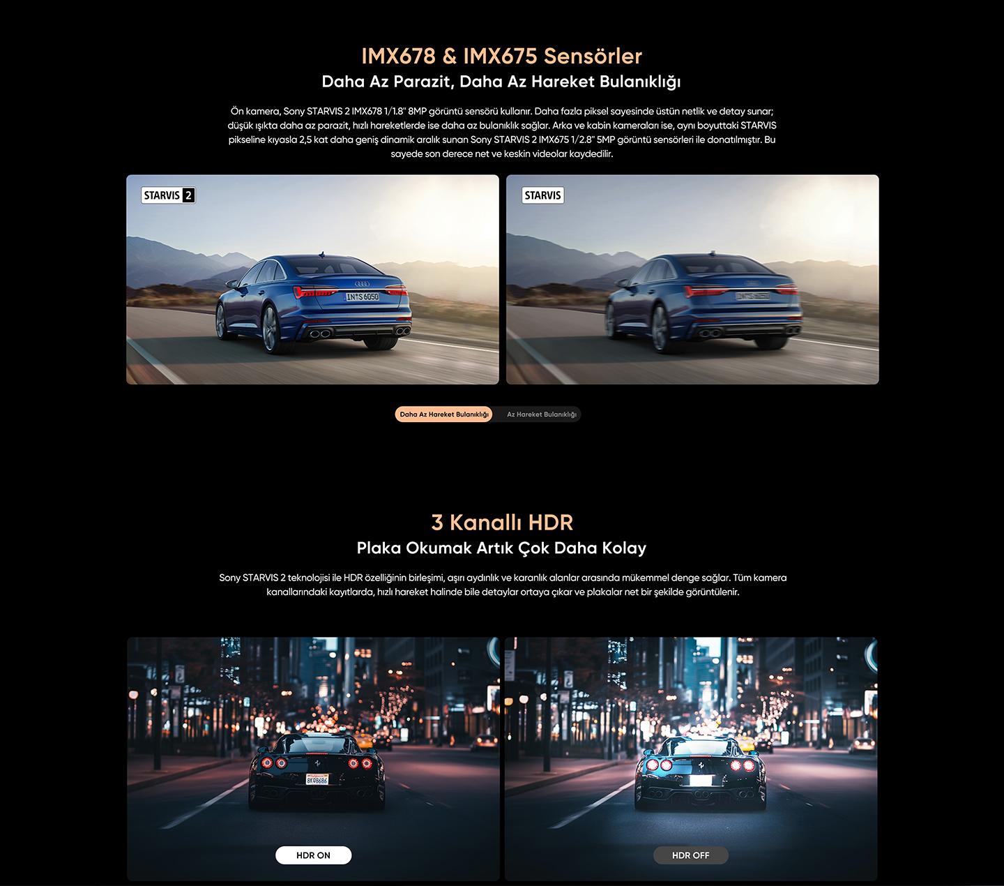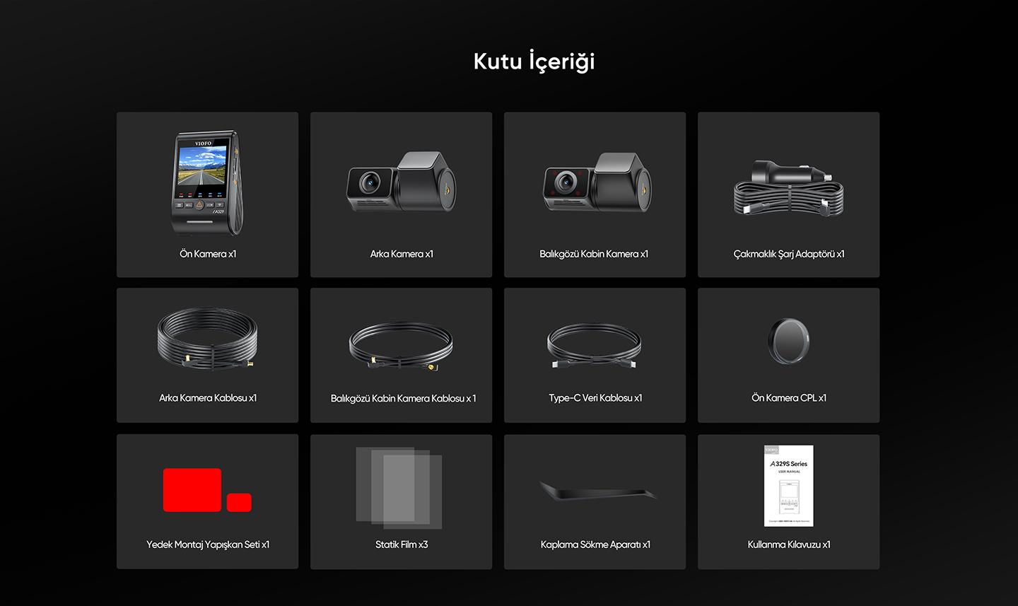 Bu araç kamerası sistemi ön kamerada 4K 30FPS, arka kamerada 2K HDR ve iç Kamerada'da 2K kayıt yaparak hem ön, hem arka hemde kabin içerisini eşzamanlı olarak kaydeder ve tam koruma sağlar.