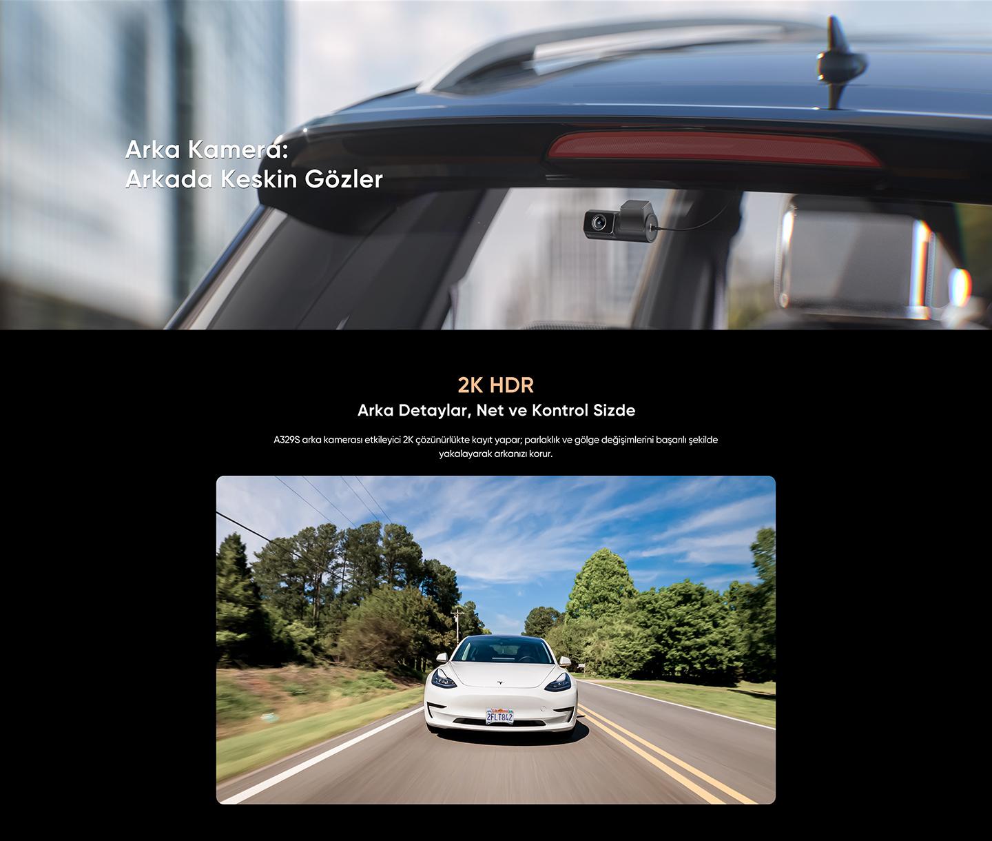 3 kameralı araç kamerası sistemi olarak A329S, arka kamerasıyla etkileyici 160° derece geniş görüş açısı ve 2K çözünürlükte kayıt yapar. Işık-gölge değişimlerinde detaylı videolar yakalayarak arkanızı koruyan bu araç içi kamera, tam güvenlik sağlar.