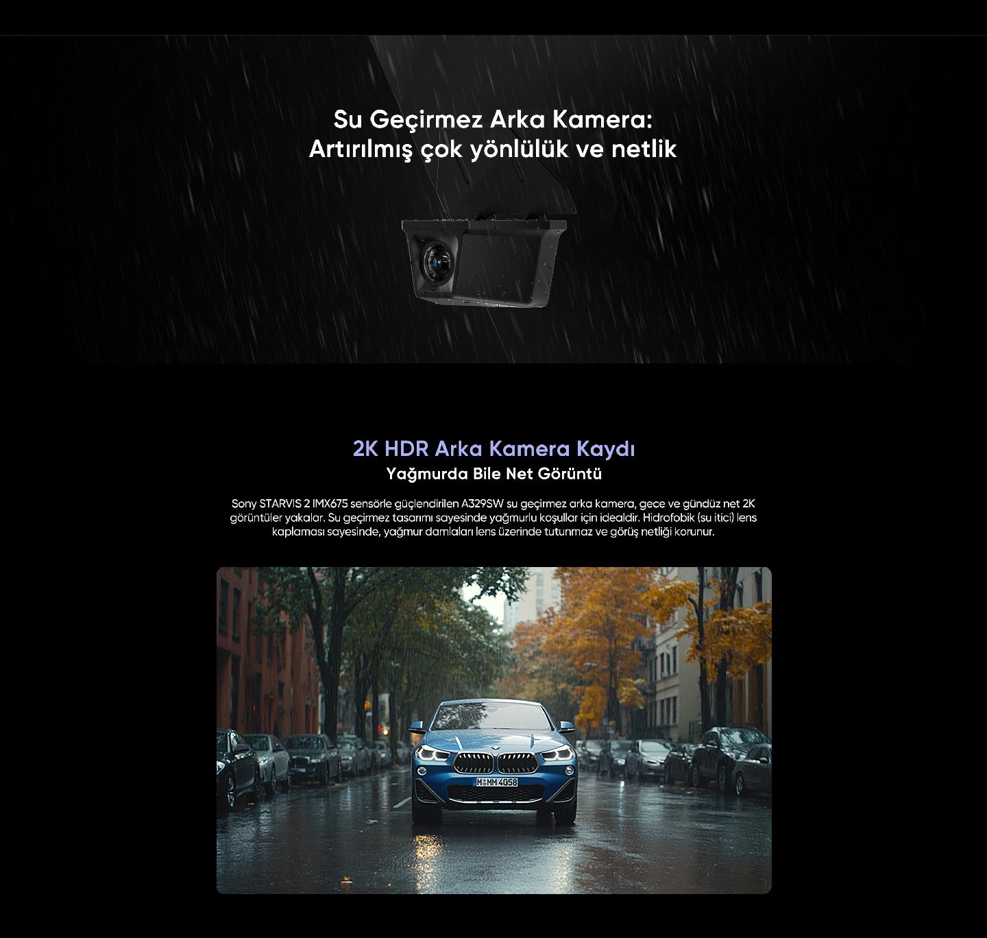 IP67 su geçirmez arka araç kamerası, yağmurlu havalarda bile kristal netlikte 2K HDR kayıt yapar. Sony STARVIS 2 IMX675 sensörü ile donatılmış bu araba kamerası, hidrofobik lens kaplaması sayesinde su damlacıklarının lenste kalmasını önler. Esnek montaj seçenekleri ile pickup ve ticari araçlara idealdir.