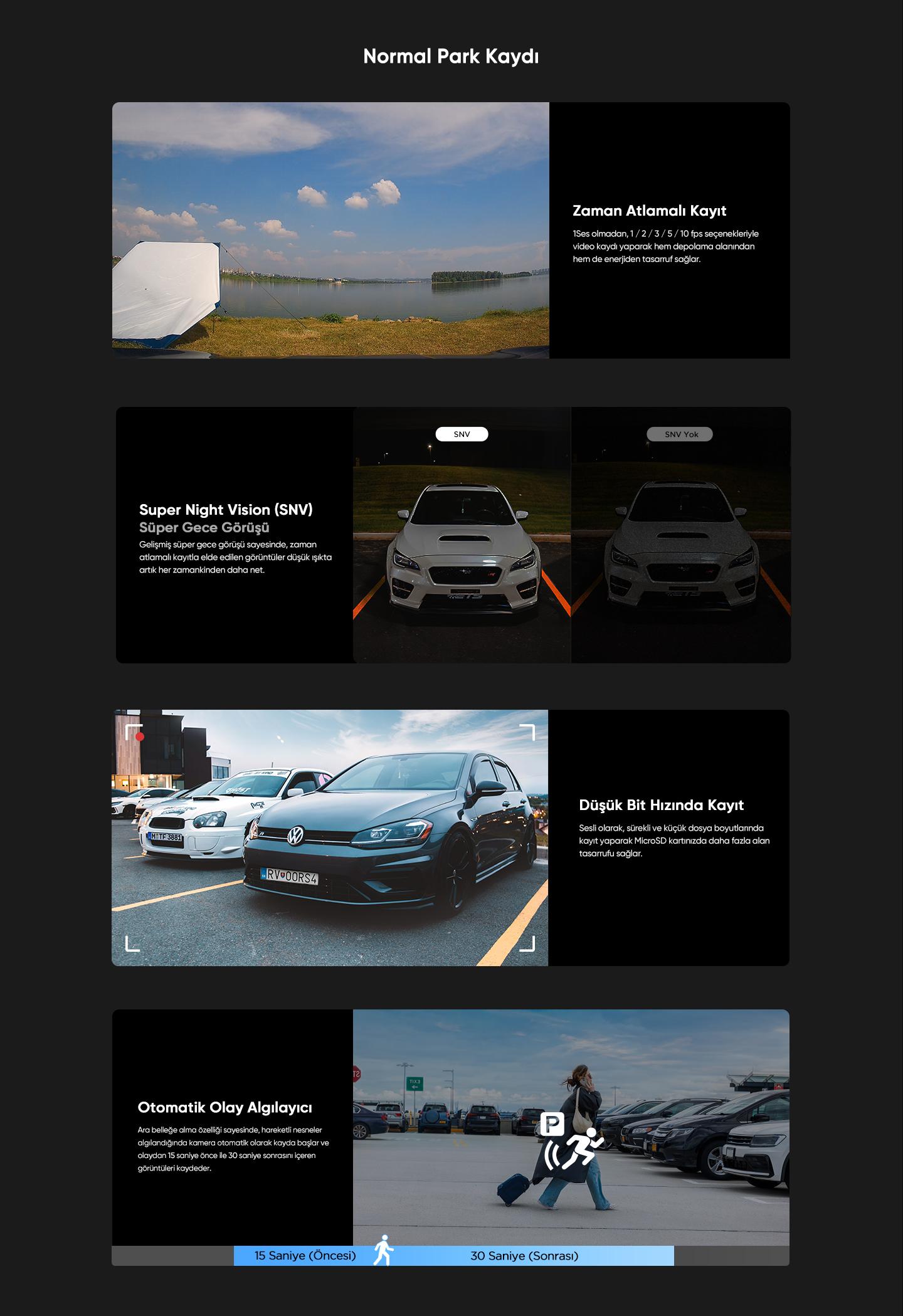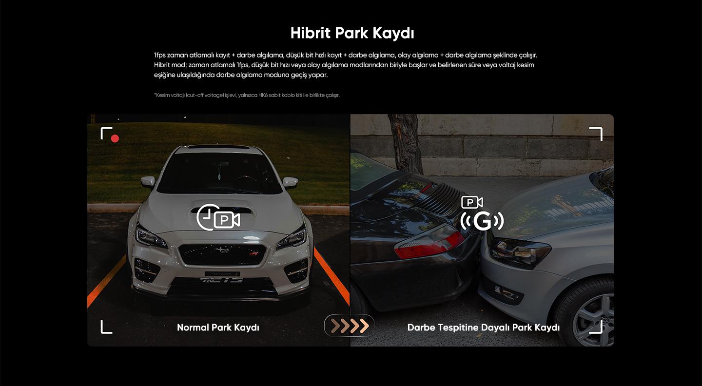 Hibrit park modu özelliği time-lapse, çarpma algılama ve hareket tespitini bir arada sunar. Düşük güç tüketimi ile araç batterisini korur, çarpma anında 2 saniyede uyanarak 1 dakika kayıt yapar. Süper gece görüş teknolojisi ile düşük ışık koşullarında bile net görüntü elde eder.