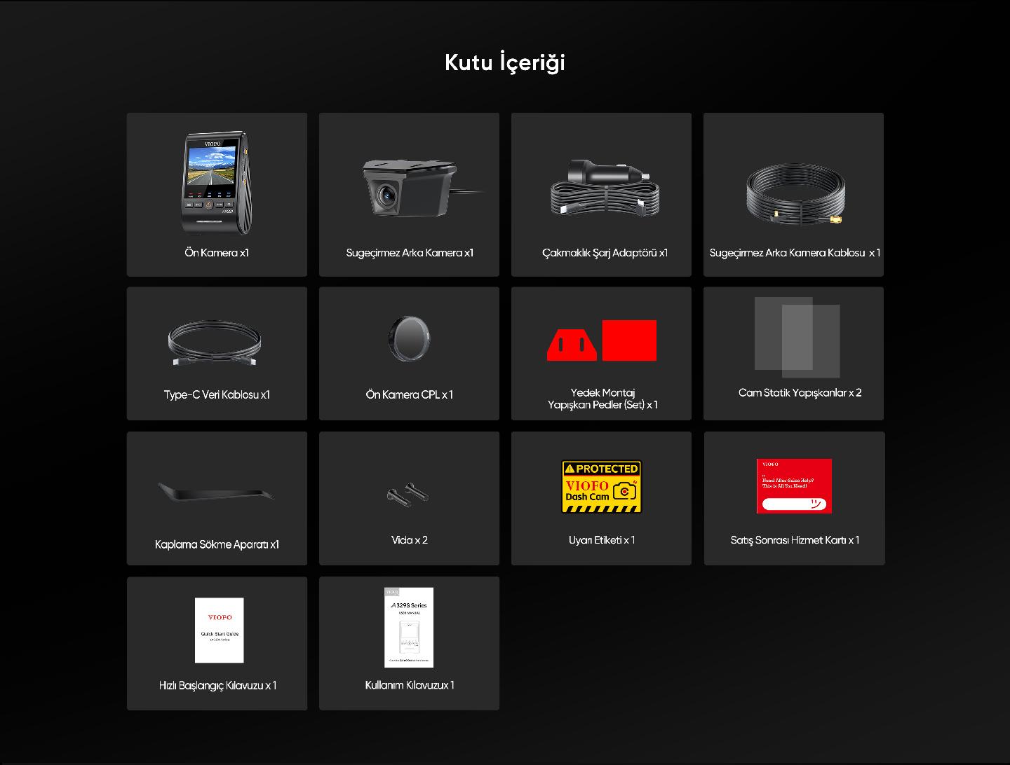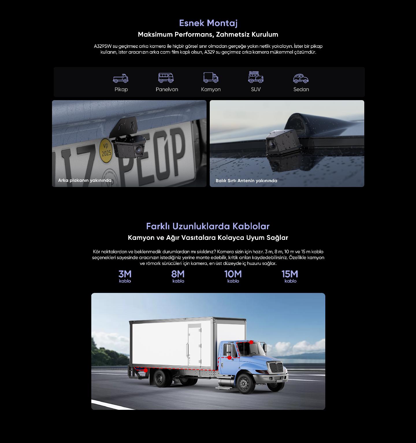 VIOFO A329SW tüm araç tiplerinde kullanılabilir. 3M, 8M, 10M ve 15M kablo seçenekleri ile otomobil, pickup, kamyon ve ticari araçlarda rahatlıkla monte edilebilir. Su geçirmez arka kamera tasarımı sayesinde açık kasa araçlarda da mükemmel performans gösterir.