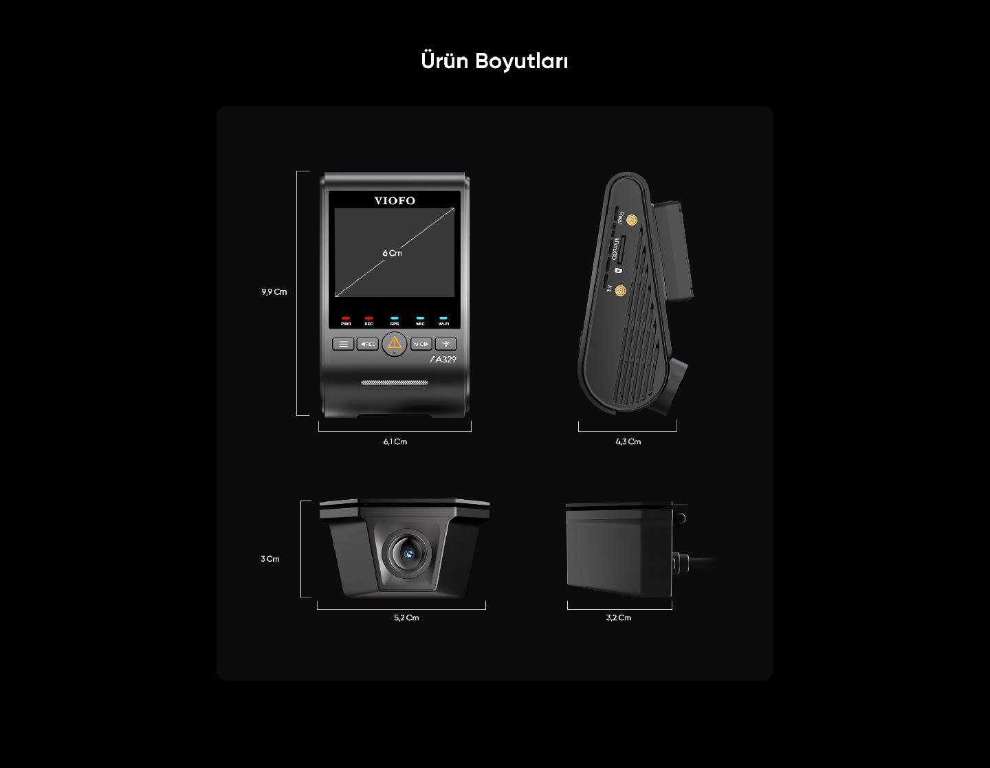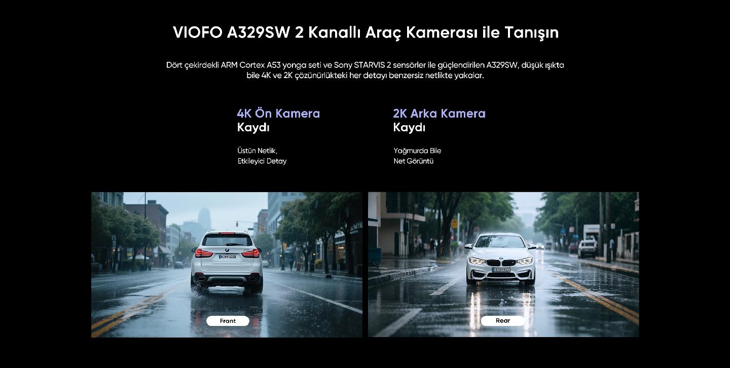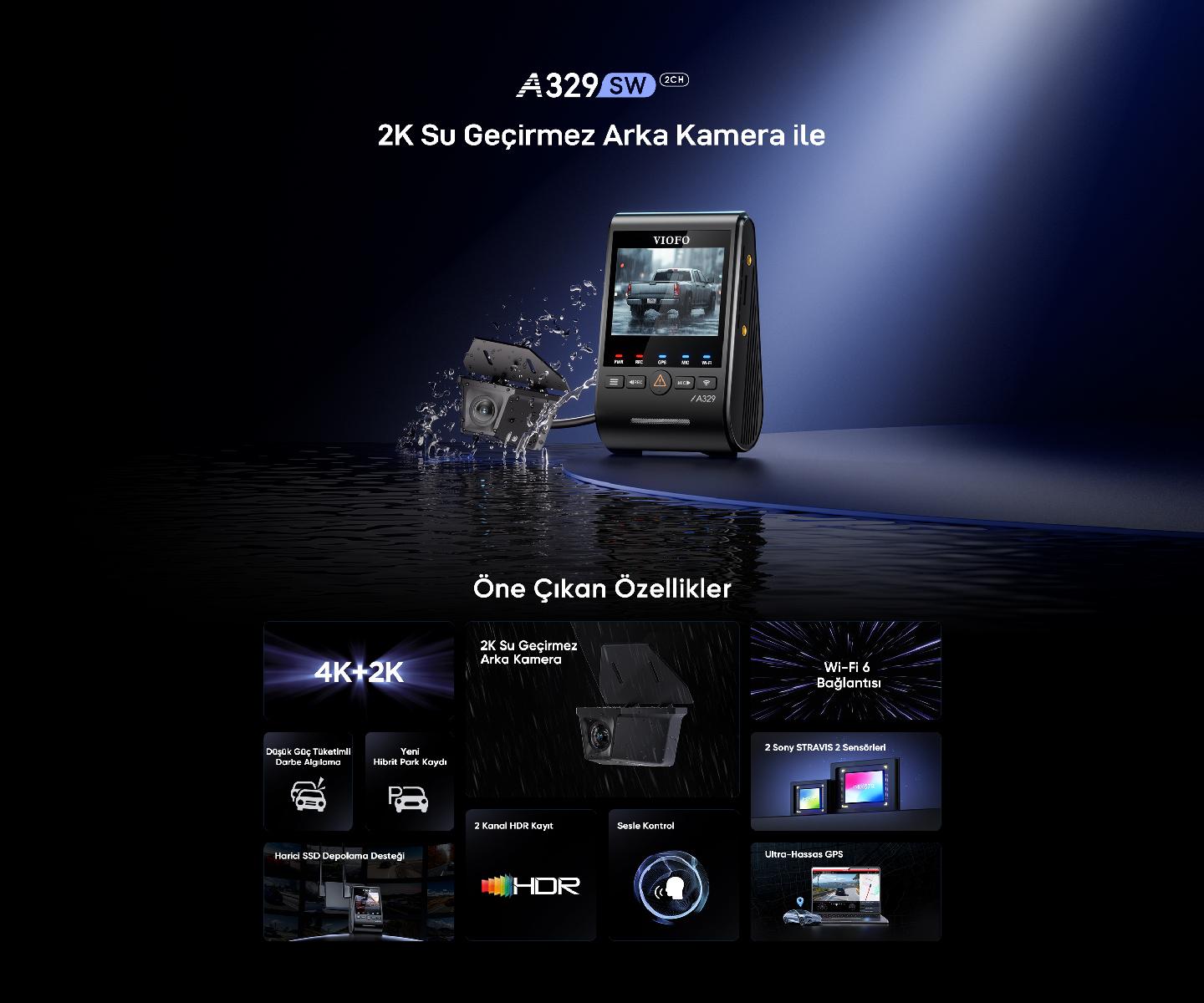 VIOFO A329SW 2 kameralı ön ve su geçirmez arka araç kamerası, Sony STARVIS 2 sensörleri ile donatılmış profesyonel bir araç kamerası sistemidir. 4K 60FPS ön kayıt ve 2K HDR arka kayıt özelliği ile yolculuğunuzda maksimum güvenlik sağlar. GPS tracking, konum takibi ve WiFi 6 bağlantısı ile gelişmiş araç kamerası deneyimi sunar.