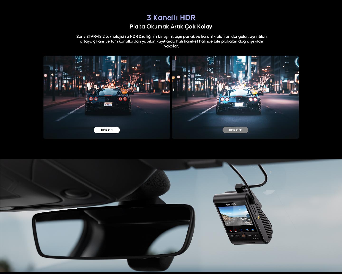 Sony STARVIS 2 IMX678 1/1.8" 8MP sensörü ile donatılmış ön araç kamerası, 4K 60FPS çözünürlükte son derece akıcı ve net görüntüler kaydeder. Gelişmiş araç kamerası teknolojisi sayesinde hızlı hareket halindeki sahneleri bile mükemmel detayda yakalar. HDR özelliği ile parlak ve karanlık alanları dengeler, plaka okuma performansını artırır.