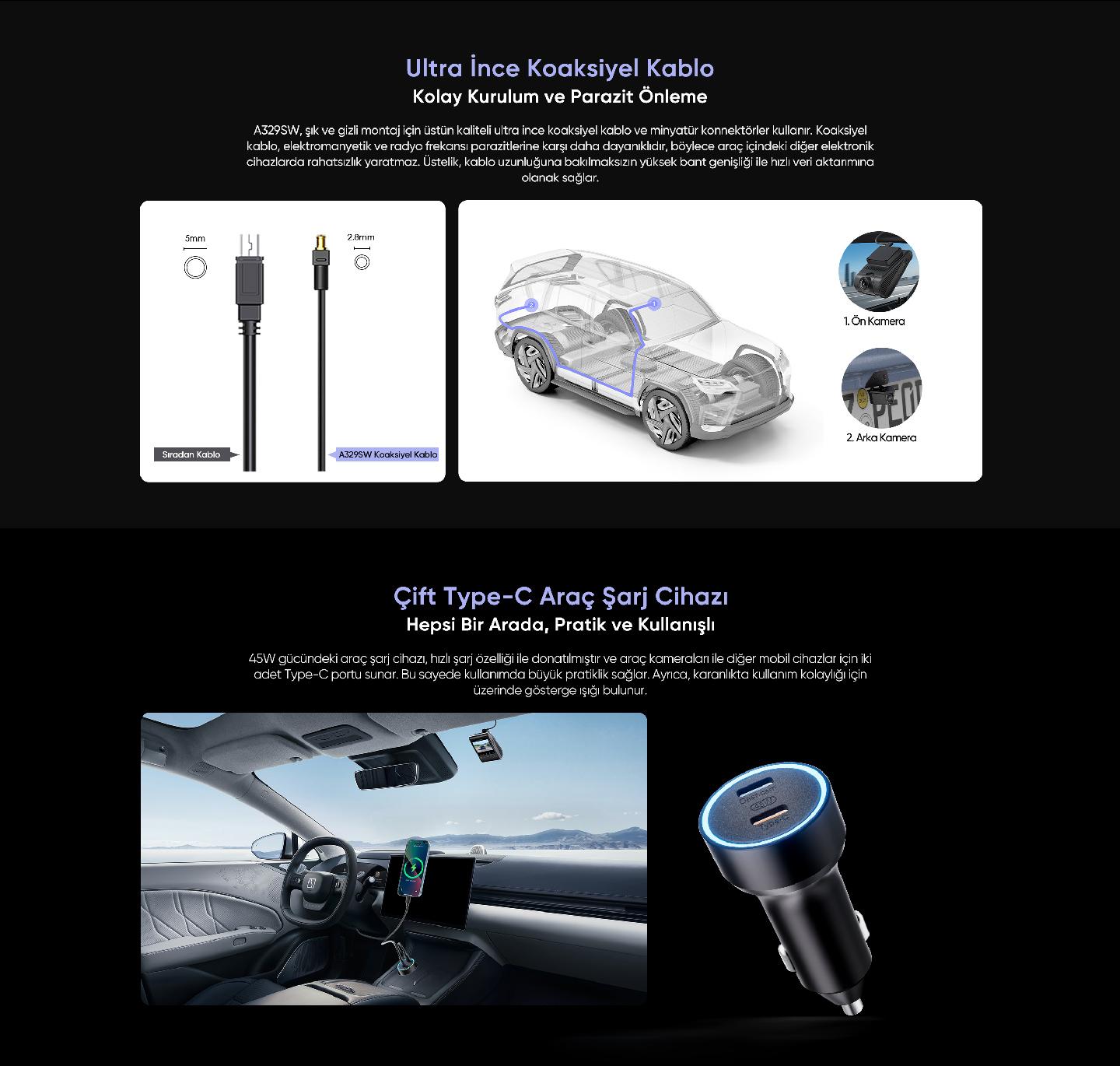 - Güç: DC 5.0V/2A, 45W çift Type-C araç şarjı