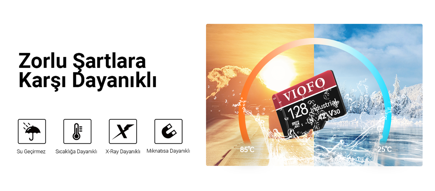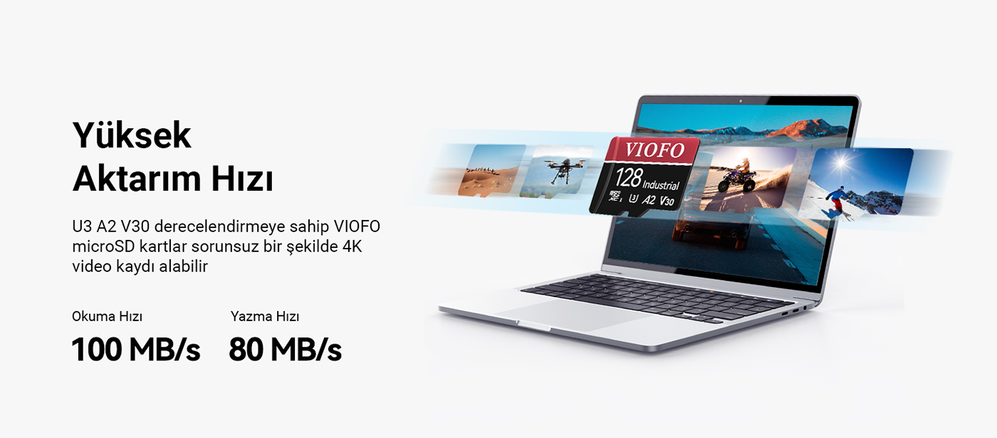 Viofo High Endurance 128GB Class 10 A2 V30 100MB/s Okuma 80MB/s Yazma Micro SD Hafıza Kartı, Viofo kameralar ile tam uyumlulukta çalışır. 100MB/s Okuma 80MB/s Yazma hızı ile yüksek çözünürlüklü dosyalarınız, fotoğraflarınız ve video kayıtlarınızı sorunsuz bir şekilde depolar. Araç kameranız haricinde aksiyon kamerası, fotoğraf makinesi ve telefon gibi harici depolama ihtiyacı olan cihazlarla'da kullanabilirsiniz. Yüksek dayanıklılığı sayesinde tekrarlanan okuma yazma işlemlerine ve yoğun iş yüküne karşı dayanıklıdır bunun yanında suya, ısıya, x-ray ve manyetik dalgalara karşı'da dayanıklıdır. U3 ve V30 hız performansı ile düşük hızlar ya da kaybolan karelerin önüne geçer ve 4K Ultra-HD videoları sorunsuz bir şekilde depolar. Kutu içerisinden çıkan adaptör ile SD kart girişi bulunan bilgisayarınıza kolayca bağlantı sağlayıp depolanan verilerinize erişebilirsiniz.