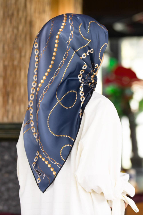 Violla Kristal Degradeli Ve Zincir Desenli İndigo Renkli 90x90 Eşarp (İpek İçermez) Kenar Dikiş Şekli El Dikişli