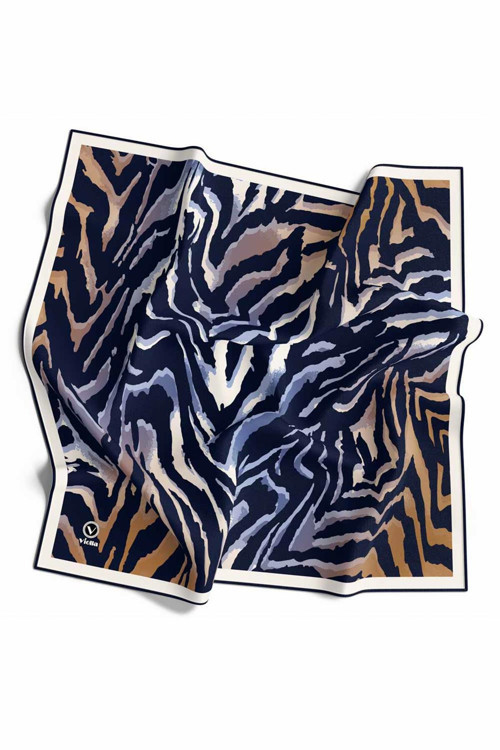 Violla Kristal Zebra Desenli Bej - Lacivert Renkli 90x90 Eşarp (İpek İçermez) Kenar Dikiş Şekli El Dikişli