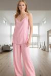 Yumuşak viskondan üretilen bu pembe çizgili pijama takımıyla kendinizi evinizde bulutlar üzerinde hissedeceksiniz. İnce askılı üst ve rahat regular kalıbıyla gün boyu konfor sunar. Şık çizgili deseni, evinizde bile tarzınızı yansıtmanıza yardımcı olur. Normal bel ve boru paça tasarımıyla, rahat hareket etmenizi sağlar. Yaz aylarında serin kalmanız için mükemmel bir seçenektir. Makinede yıkanabilmesi pratikliği tamamlar. Bu iki parçalı pijama takımı, şık görünüm ve rahatlığı birleştirir. Hem evde dinlenirken, hem de misafir ağırlama esnasında rahatlığınızdan ödün vermeden şıklığı yakalayabilirsiniz. Nefes alan ve yumuşak viskoz kumaş, gün boyu konfor sağlar. Siz de bu mükemmel uyumu deneyimleyin!