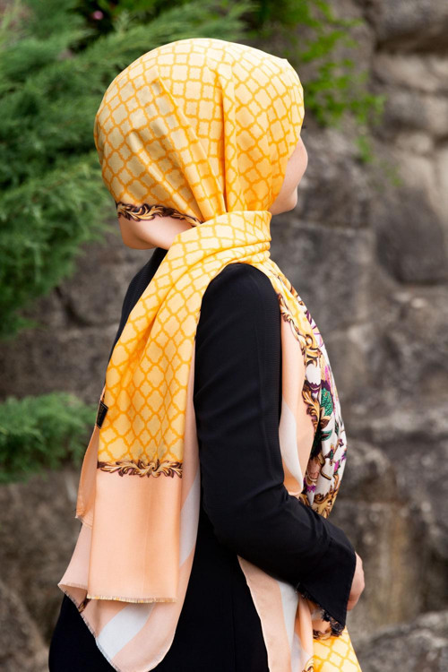 Vissona %100 İpek Dokuma Çiçek Desenli Limon Sarısı - Somon Renkli 92x210 Şal