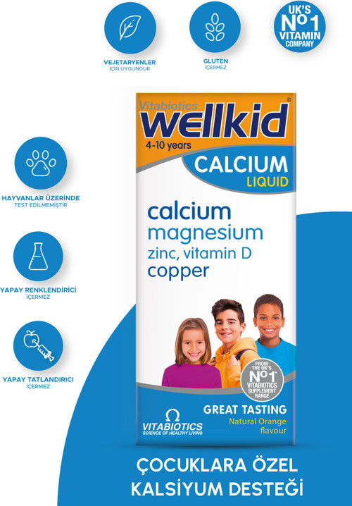Vitabiotics wellkid calcium liquid şurup 150 ml ürün boyutu 150 ml yaş grubu 4 yaş ve üzeri ürün içeriği her 10 ml kalsiyum 300 mg magnezyum 125 mg çinko 3 mg vitamin d3 7 ?g bakır 250 ?g kullanım şekli 4-10 yaş arası çocuklarda günde 2 ölçek (10 ml) alınması tavsiye edilir. Ürün stok kodu : Vis-Vtb-025 ürün barkodu : 5021265251407