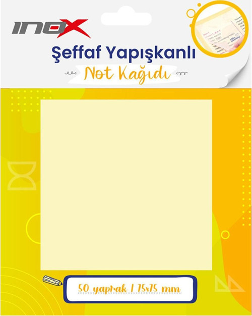 İnox Şeffaf Yapışkanlı Not Kağıdı 75x75 Sarı 50'li