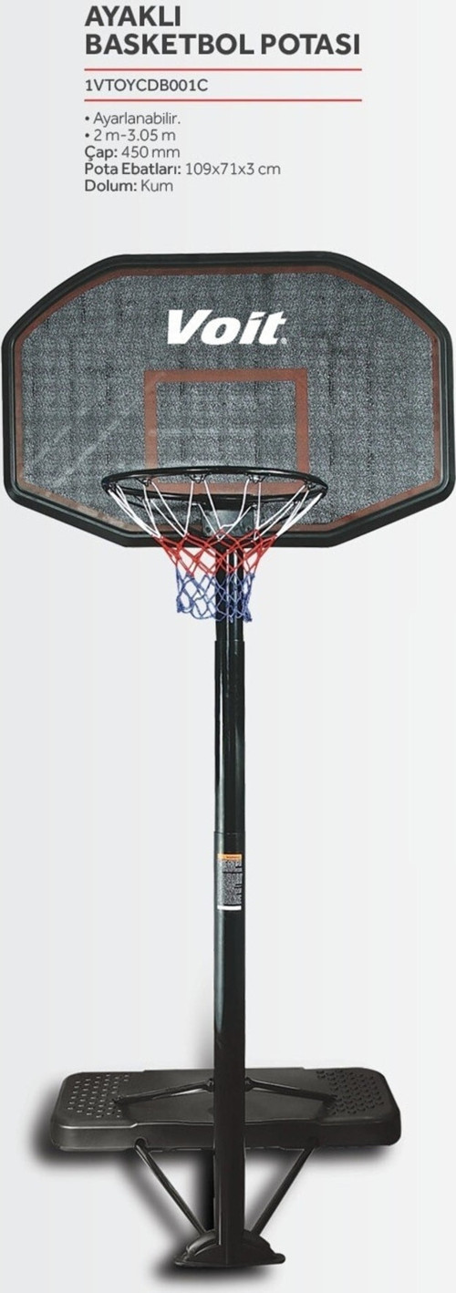 Voit CDB001C Yüksekliği Ayarlanabilir Ayaklı Seyyar Basketbol Potası Özellikleri: Ayarlanabilir Yükseklik: 2mt - 3,05mt Çember Çapı: 450 mm Pota Panya Ebatları: 109x71 cm Taban Ebatları: 109x52x12 cm Profil Kalınlığı : 80 mm çaplı Diğer Özellikler : Kum doldurulabilir. Servis & Kargo : Ücretsiz kargo 2 yıl garanti. 81 ilde ve 110 noktada teknik servis imkanı.