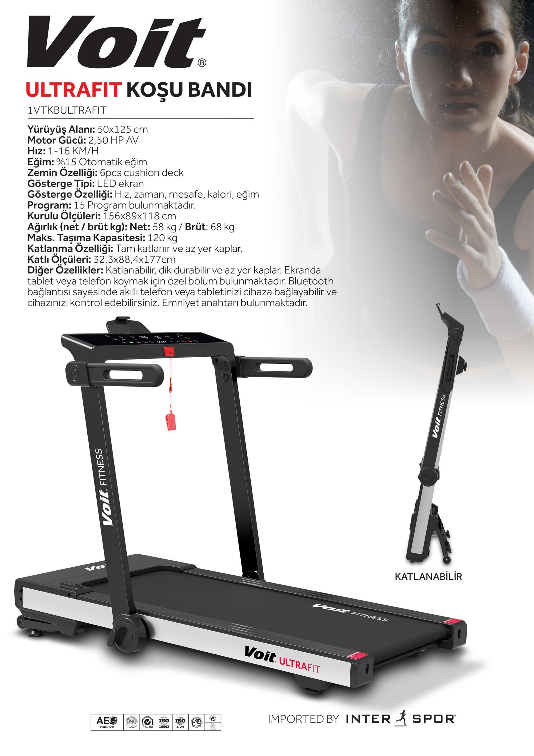 Voit Ultrafit Otomatik Eğimli Kurulum Gerektirmeyen Katlanabilen Uygulama Destekli Koşu Bandı 120kg Kapasiteli