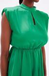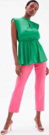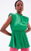 Dik ve damla yaka, kolsuz, vatkalı, bel lastikli, volanlı saten bluz.