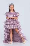 Kız Çocuk Omzu Açık Göğsü Fırfırlı Çiçek Detaylı Mor Abiye - Image 1