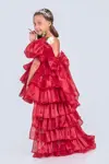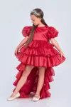 Kız Çocuk Dik Yaka Beli Manşetli Çiçek Detaylı Kuyruklu Kabarık Mercan Abiye - Image 1