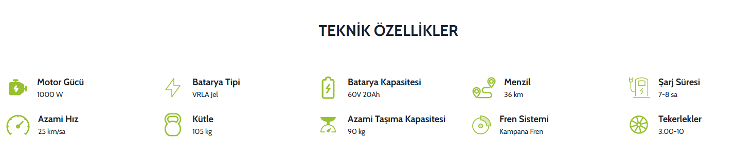 1000 W motor gücü ve 60V 20Ah VRLA Jel bataryası ile APEC APM2, tek bir şarjla 36 km’ye kadar menzil sunar. 25 km/h azami hızı, şehir içi sürüşlerde güvenli ve kontrollü bir deneyim sağlar. Üstelik, Euro 5 çevresel performans standardına uygun teknolojisi sayesinde, çevreye duyarlı ve sürdürülebilir bir ulaşım çözümü sunar.