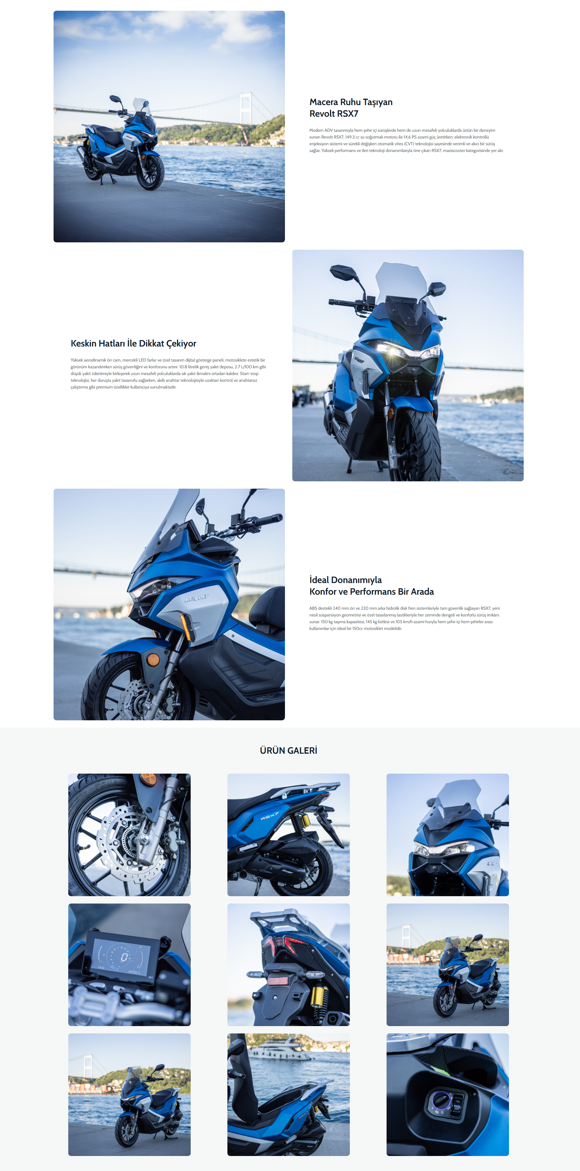 Volta Revolt Rsx7 Benzinli Motosiklet 150 Cc Lacivert Renk Macera Ruhu Taşıyan Revolt RSX7 Modern ADV tasarımıyla hem şehir içi sürüşlerde hem de uzun mesafeli yolculuklarda üstün bir deneyim sunan Revolt RSX7, 149.3 cc su soğutmalı motoru ile 14.6 PS azami güç üretirken; elektronik kontrollü enjeksiyon sistemi ve sürekli değişken otomatik vites (CVT) teknolojisi sayesinde verimli ve akıcı bir sürüş sağlar. Yüksek performans ve ileri teknoloji donanımlarıyla öne çıkan RSX7, maxiscooter kategorisinde yer alır. Keskin Hatları İle Dikkat Çekiyor Yüksek aerodinamik ön cam, mercekli LED farlar ve özel tasarım dijital gösterge paneli, motosiklete estetik bir görünüm kazandırırken sürüş güvenliğini ve konforunu artırır. 10.8 litrelik geniş yakıt deposu, 2.7 L/100 km gibi düşük yakıt tüketimiyle birleşerek uzun mesafeli yolculuklarda sık yakıt ikmalini ortadan kaldırır. Start-stop teknolojisi, her duruşta yakıt tasarrufu sağlarken, akıllı anahtar teknolojisiyle uzaktan kontrol ve anahtarsız çalıştırma gibi premium özellikler kullanıcıya sunulmaktadır. İdeal Donanımıyla Konfor ve Performans Bir Arada ABS destekli 240 mm ön ve 220 mm arka hidrolik disk fren sistemleriyle tam güvenlik sağlayan RSX7, yeni nesil süspansiyon geometrisi ve özel tasarlanmış lastikleriyle her zeminde dengeli ve konforlu sürüş imkânı sunar. 150 kg taşıma kapasitesi, 145 kg kütlesi ve 105 km/h azami hızıyla hem şehir içi hem şehirler arası kullanımlar için ideal bir 150cc motosiklet modelidir. Volta RSX7 Benzinli 150 cc Lacivert Motosiklet Tescil ve ruhsatlandırma işlemi gerektiren motosiklet modellerinde cayma hakkı kullanılmamaktadır. Mevzuat gereği 125 cc üzeri motosikletlerin kullanımı için zorunlu trafik sigortası ve A2 sınıfı sürücü belgesi gerekmektedir. RSX7, 149.3 cc su soğutmalı motoruyla 14.6 PS güç üretir. Start-stop sistemi sayesinde her kalkışta enerji verimliliği sağlar. CVT şanzıman ve yüksek tork değerleri, şehirde ve yolda sorunsuz bir hızlanma deneyimi sunar. Güvenlik ABS destekli ön/arka disk fren sistemi (240 mm & 220 mm), aniden durmanız gereken anlarda bile maksimum kontrol sunar. LED aydınlatmalar ve dijital ekran, gece sürüşlerinde daha fazla görünürlük ve veri takibi sağlar. Kullanım Akıllı anahtar teknolojisiyle anahtarsız çalıştırma ve uzaktan kontrol sunan RSX7, dijital göstergesi ve ergonomik oturma yapısıyla sürücülere konfor sağlar. Geniş depo kapasitesi ile uzun sürüşler planlamanıza olanak tanır. Yakıt 2.7 L / 100 km yakıt tüketimi ile RSX7, 10.8 litrelik deposuyla uzun mesafe yolculuklarda avantaj sunar. Start-stop teknolojisi sayesinde yakıt tüketimini minimuma indirirken çevre dostu Euro 5+ egzoz emisyonuyla doğaya katkı sağlar. Macera Ruhu Taşıyan Revolt RSX7 Modern ADV tasarımıyla hem şehir içi sürüşlerde hem de uzun mesafeli yolculuklarda üstün bir deneyim sunan Revolt RSX7, 149.3 cc su soğutmalı motoru ile 14.6 PS azami güç üretirken elektronik kontrollü enjeksiyon sistemi ve sürekli değişken otomatik vites (CVT) teknolojisi sayesinde verimli ve akıcı bir sürüş sağlar. Yüksek ve ileri teknoloji donanımlarıyla öne çıkan RSX7, maxiscooter kategorisinde yer alır. Keskin Hatları İle Dikkat Çekiyor Yüksek aerodinamik ön cam, mercekli LED farlar ve özel tasarım dijital gösterge paneli, motosiklete estetik bir görünüm kazandırırken sürüş güvenliğini ve konforunu artırır. 10.8 litrelik geniş yakıt deposu, 2.7 L/100 km gibi düşük yakıt tüketimiyle birleşerek uzun mesafeli yolculuklarda sık yakıt ikmalini ortadan kaldırır. Start-stop teknolojisi, her duruşta yakıt tasarrufu sağlarken, akıllı anahtar teknolojisiyle uzaktan kontrol ve anahtarsız çalıştırma gibi premium özellikler kullanıcıya sunulmaktadır. İdeal Donanımıyla Konfor ve Bir Arada ABS destekli 240 mm ön ve 220 mm arka hidrolik disk fren sistemleriyle tam güvenlik sağlayan RSX7, yeni nesil süspansiyon geometrisi ve özel tasarlanmış lastikleriyle her zeminde dengeli ve konforlu sürüş imkânı sunar. 150 kg taşıma kapasitesi, 145 kg kütlesi ve 105 km/h azami hızıyla hem şehir içi hem şehirler arası kullanımlar için ideal bir 150cc motosiklet modelidir. 197 sayılı Motorlu Taşıtlar Vergisi Kanunu uyarınca, Satışı yapılan motosiklete ait mevct Motorlu Taşıtlar Vergisi (MTV) ödemeleri alıcıya aittir. Ek Bilgi 1. Tüm modellerde teslimat öncesi ruhsat ve plaka çıkartılması zorunludur, bu işlemler tamamlanmadan ürün teslimatı gerçekleştirilmeyecektir. 2. ÖTV beyannamesi verilmiş veya ödenmiş tüm ürünlerde ruhsat çıkartıldığından itibaren iptal ve iade yapılmamaktadır.