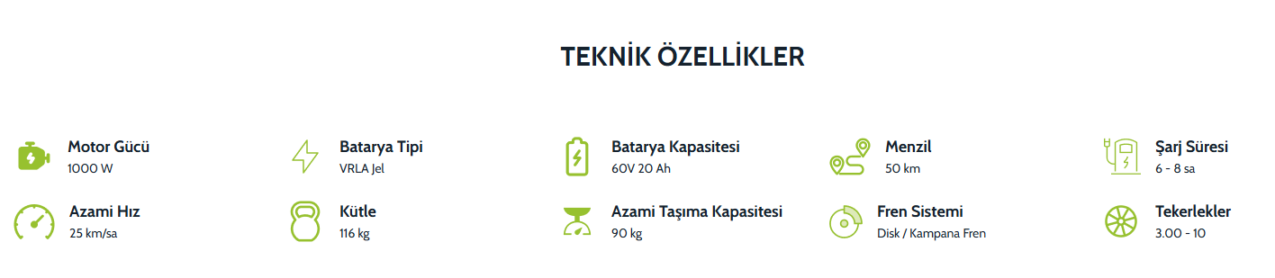 1000W motor gücü ve 60V 20Ah VRLA Jel batarya, Volta VM6’nın günlük kullanımda etkileyici bir performans sergilemesini sağlar.
