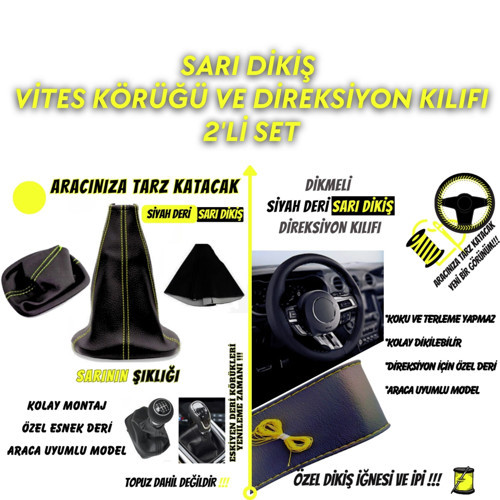 Volvo S60 Uyumlu Siyah Deri Sarı Dikiş Direksiyon Kılıfı ve Vites Körüğü 2'li Set.