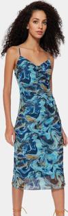 Vücut hatlarınızı mükemmel bir şekilde sergileyen bu mavi elbise, gardırobunuzun yeni favorisi olacak. Yüksek kaliteli örme tül kumaştan üretilen elbise, hem şık hem de konforlu bir deneyim sunuyor. İnce askıları ve midi boyu ile her mevsim kullanabileceğiniz bu elbise, günlük yaşamınızdan özel davetlerinize kadar birçok ortamda rahatlıkla tercih edebilirsiniz.