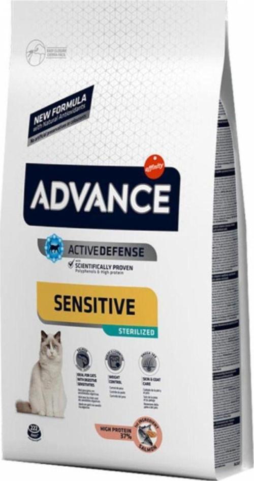 Hassas sindirime sahip kediler için tam ve özel mamadır. Özellikle kısırlaştırılmış kediler için üretilmiş mamadır. Kısırlaştırılmış kedileri koruma, azaltılmış metabolize edilebilen enerji seviyesi, tokluk hissi için yüksek lif seviyesi, kas kitlelerini korumak için yüksek protein ve ideal yağ seviyeleri üriner bozuklukların azalmasına yardımcı olur. Uygun pH su alımın artırmak ve diüretik için yükseltilmiş sodyum seviyesi, idrar taşı oluşumundan korunmak için glycosaminoglycan Insülin duyarlılığını artırır. Düşük karbohidrat seviyeleri ile matabolizmanın düzenlenmesine katkı sağlar.Advance, vitamin E, vitamin C, bioflavonoidler, selenyum, çinko, bakır, manganez ve taurinden oluşan antioksidan sistemi ile hücresel yaşlanmayı engeller ve sağlıklı yaşamı uzatarak yaşlanmayı geciktirir.İçerdiği immunoglobulinler hızlı bir bağışıklık yanıtı sağlayarak sindirim sistemini, özelliklede bağırsak florasını korur. Kalp sağlığını koruyan taurin katkılıdır. Linoleik asit, omega 3 yağ asitleri, biyotin ve çinko içerdiğinden sağlıklı bir deri ve tüy yapısı sağlar. Kedinizin parlak ve pürüzsüz bir kürke sahip olmasına yardımcı olur. İçeriğindeki mineral tuzların yanısıra şekli ve boyut olarak özel tasarlanmış olan Advance, plak oluşumunu ve diş çürüklerini engelleyerek ağız sağlığını korur. Dengeli mineral ve bileşen kombinasyonu kedinizin idrarındaki pH seviyesinin az asitli olmasını sağlayarak idrar taşlarının oluşumunu engeller. Özel formülünde yer alan omega 3 yağ asitleri, özellikle de DHA, merkezi sinir sisteminin gelişmesini, taurin ise özellikle yavrularda retinanın gelişmesine, yetişkinlerde ise göz sağlığının korunmasına yardımcı olur. Dengeli protein içeriği ile kısırlaştırılmış olan kedinizin formda kalmasını ve kilosunun korunmasını sağlar. İçeriğindeki nükleotidler DNA ve RNA öğeleri sayesinde kedinizin bağışıklık sistemini güçlendirmeye yardımcı olur. İçerik Somon Balığı (%18) Mısır Proteini Mısır Kurutulmuş Somon Proteinleri Buğday Proteini Arpa (%8) Protein Hidrolisat Bezelye Lifi Buğday Pancar Püresi Hayvansal Yağlar Bitkisel Lifler Tuz Potasyum Klorür Plazma Proteinleri (%0,4) İnulin Trikalsiyum Fosfat Soya Yağı Doğal Polifenoller (%0,01) Analiz Raporu Protein % 37 Yağ İçeriği %11,5 Ham Lifler %4 İnorganik Madde % 7 Omega 3 % 0,7 Omega 6 %1,4 Besin Katkı Maddeleri Vitamin A 27000 IU/kg Vitamin D3 1800 IU/kg Vitamin E 500 mg/kg Vitamin C 70 mg/kg Biotin 0,24 mg Taurine 1200 mg L-karnitin 500 mg Demir fumarat 150 mg (Fe: 45 mg) Demir sülfat monohidrat 260 mg (Fe: 86 mg) Potasyum iyodür 1.9 mg (I: 1.4 mg) Bakır sülfat pentahidrat 33 mg (Cu: 8.8 mg) Manganez sülfat monohidrat 123 mg (Mn: 40 mg) Çinko sülfat monohidrat 407 mg (Zn: 148 mg) Sodyum selenit 0,2 mg (Se: 0.1 mg) Zooteknik katkılar