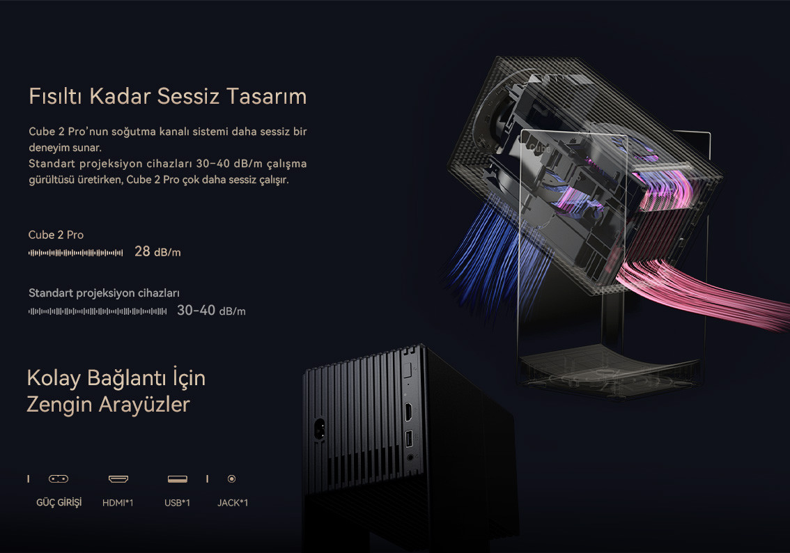 · 28 Desibel (dB) Ses Seviyesi: Ortalama bir fısıltıdan daha sessiz olan bu çalışma seviyesi, projeksiyon cihazının soğutma fanının neredeyse duyulmaz olduğu anlamına gelir. Film izlerken veya sunum yaparken cihaz sesi dikkatinizi dağıtmaz, sessiz ve konforlu bir deneyim sunar.