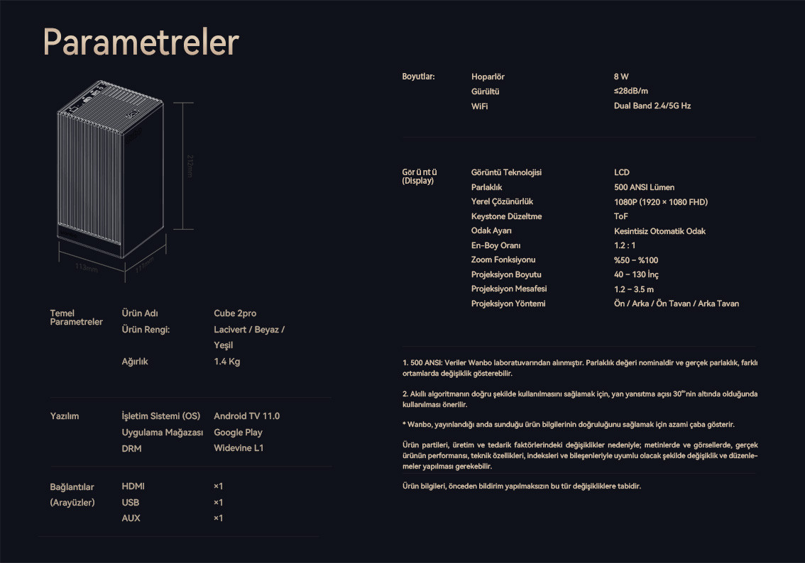Kısacası, Wanbo Cube 2 Pro, gelişmiş otomatik ayarlar, kullanım kolaylığı ve kaliteli görüntüyü tek bir pakette sunan, günümüz akıllı projeksiyon teknolojisinin popüler özelliklerini barındıran bir üründür.