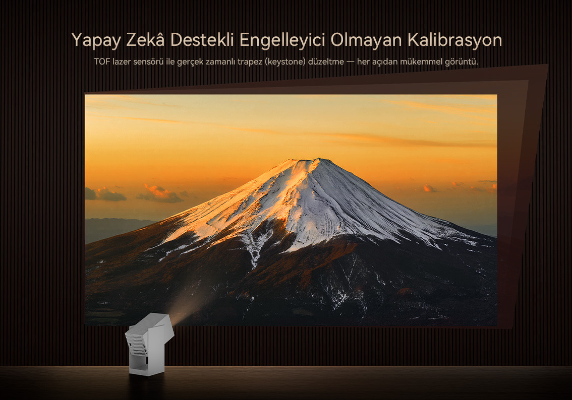 · TOF + Otomatik Kenar Düzeltme (Keystone) & Dört Köşe Ayarlama: Sadece odaklamayı değil, aynı zamanda projeksiyon cihazının konumundan kaynaklanan yamuk (yamuk) görüntüyü de otomatik olarak düzeltir. Cihazı perdenin tam karşısına koyamadığınız durumlarda (örneğin sehpanın yan tarafına) bile, TOF sensörü ve yazılımı, görüntüyü hızla algılayarak dikdörtgen ve düzgün bir forma getirir. Manuel olarak dört köşesini de ayarlama imkanı verir. Bu, kurulum esnekliği sağlar.