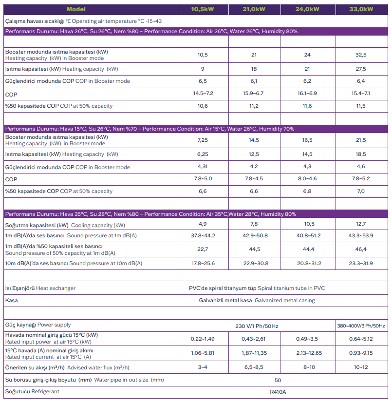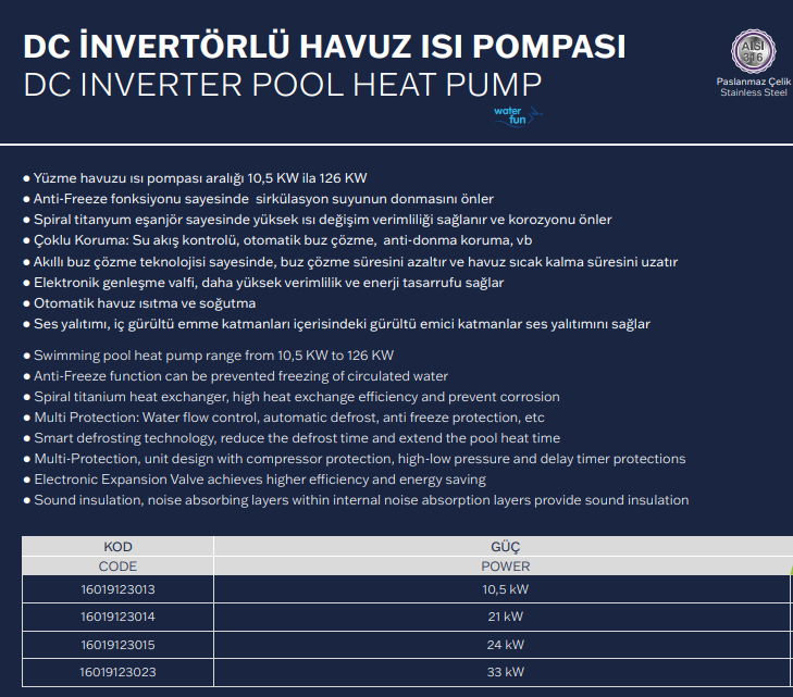 • Yüzme havuzu ısı pompası aralığı 10,5 KW ila 126 KW
