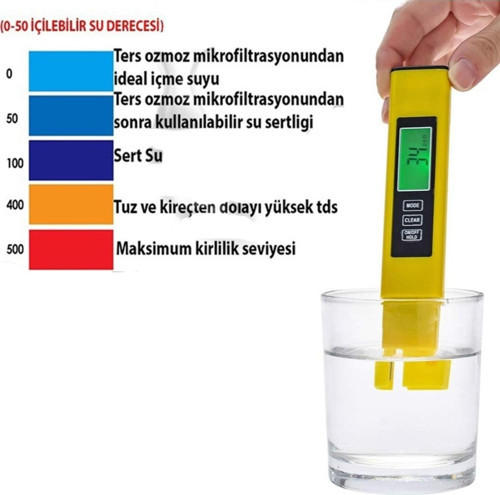 İçtiğiniz satın aldığınız suları veya damacanalarda içtiğiniz suları yarım su bardağına cihazı daldırın ve çıkan değer 0-90 üzeri bir değer çıkarsa lütfen bu suları sağlığınız açısından tercih etmeyin. Tabii sağlığınızı böbreğinizi kendinizi, ailenizi çocuklarınızı düşünüyorsanız. Bu cihazlar, giriş ve çıkış TDS değerlerini aynı anda ölçüp, cihaz, membran ve filtre performansını izleyebilmek için idealdir. Bu ölçümler ile suyunuzun sertliği ve saf olup olmadığını bilirsiniz.