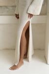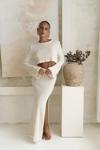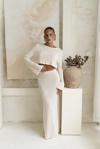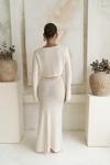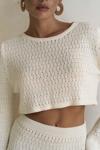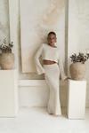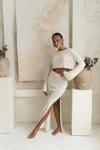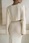 Geniş yaka, uzun kollu, triko crop. Manşetleri geniş kesim, ajur tasarımlı. Elastik bel, A kesim midi boy triko etek. Ajur tasarım, astarsız.