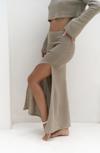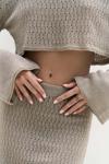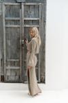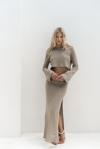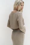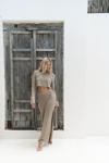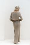 Geniş yaka, uzun kollu, triko crop. Manşetleri geniş kesim, ajur tasarımlı. Elastik bel, A kesim midi boy triko etek. Ajur tasarım, astarsız.