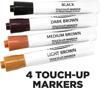 Rötuş Kalemleri: Onarılması gereken ahşap yüzeyin bitişinden daha açık olan rötuş kalem rengiyle başlayın. Tahta damarı yönünde hasarlı alanı hafifçe renklendirin. Fazla boyayı çıkarmak için alanı hemen temiz, kuru bir bezle ovun. Çevreleyen kaplama ile renk uyumu için gerektiği kadar koyu renkli işaretleyicilerle işlemi tekrarlayın. Kullanımdan sonra işaret kapaklarını değiştirin. Parlatmadan önce yüzeyin beş dakika kurumasını bekleyin.