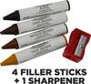 Dolgu Çubukları: Onarılması gereken ahşap kaplamanın rengine en uygun dolgu çubuğunu seçin. Dolgu çubuğunun ucunu tamamen dolana kadar hasarlı alan boyunca dik olarak hafifçe ovun. Onarımın etrafındaki ahşabın damarlarını veya gözeneklerini doldurmamaya dikkat edin. Fazla dolguyu esnek, plastik bir düzleştiriciyle veya temiz bir bez veya kağıt havluyla hafifçe parlatarak çıkarın. Gerektiğinde çubukları keskinleştirin.