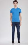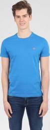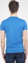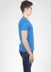 Mavi renk bisiklet yaka tişörte nakış yapılmıştır.